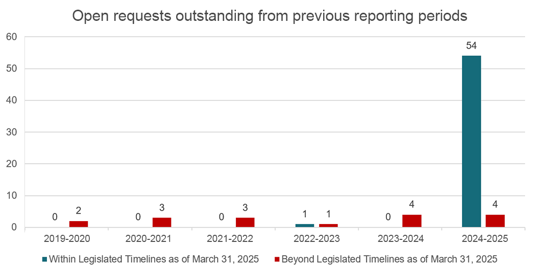 At the end of the reporting period, 72 requests were carried over to fiscal year 2025–26. As of March 31, 2025, 55 of these requests were processed within the legislated timelines and 17 requests were beyond the legislated timelines.