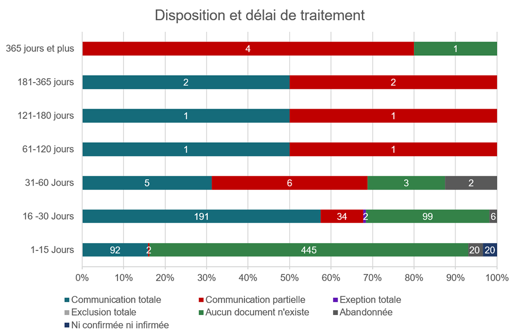 Au cours de 2024-2025, 1001 demandes ont été fermées dans les délais prescrits par la loi, ce qui représente 94,4 %. Celà reflète une réduction modeste dans la rapidité de la réponse comparé à 2023-2024 où 95,22 % des demandes ont été traitées dans les délais prescrits. De plus, 33,6 % des demandes ont fait l’objet d’une communication totale et 6,5 % des demandes ont fait l’objet d’une communication partielle. Le tableau ci-dessous résume le délai de traitement des 1001 demandes traitées en 2024-2025.