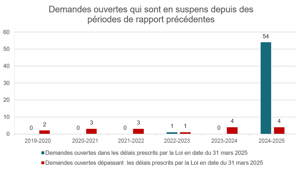 À la fin de l’année financière, 72 demandes ont été reportées à l’exercice 2025-2026. En date du 31 mars 2025, 55 de ces demandes étaient traitées dans les délais prescrits par la loi et 17 de ces demandes avaient dépassé les délais prescrits par la loi.
