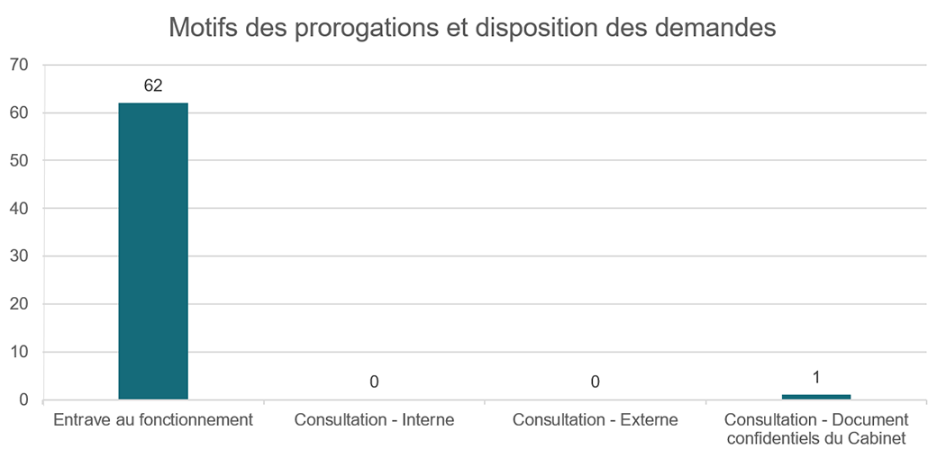 Au cours de la dernière période de référence, 62 des prorogations ont été obtenues en raison d’obstacles découlant des opérations et une prorogation a été prise en raison des documents considérés comme des confidences du Cabinet.